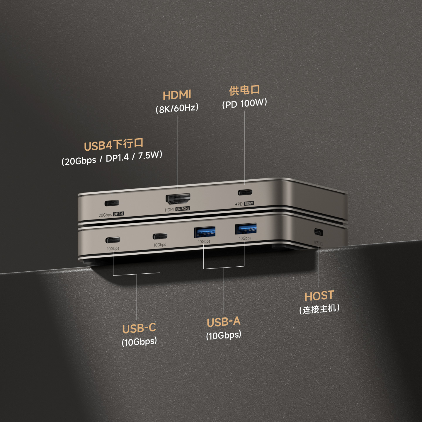 USB4 downlink port, full-function expansion, one port for multiple uses, 40Gpbs total bandwidth, meeting the high-speed read and write requirements of multiple ports simultaneously